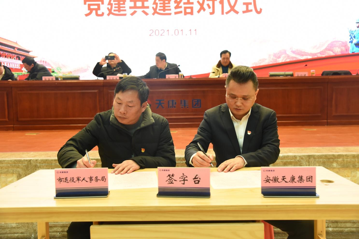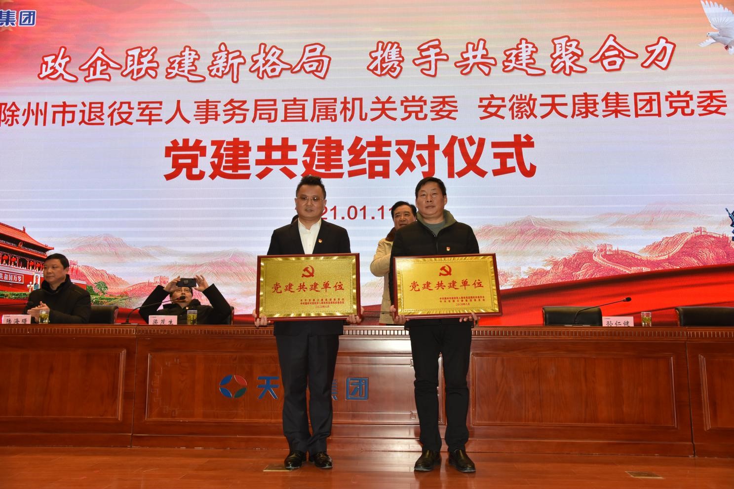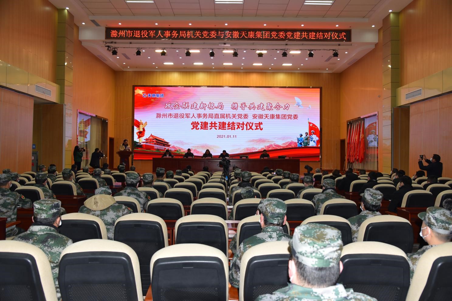 1月11日上午,滁州市退役軍人事務局直屬機關黨委與安徽天康集團黨委在會議中心隆重召開“黨建共建”簽約儀式,開啟政企聯建新格局,進一步推動企業黨建和機關黨建共同發展。滁州市退役軍人事務局黨組書記、局長楊軍,黨組副書記、副局長梁茂生,黨組成員、副局長孫仁健,黨組成員、副局長陸海曙;安徽天康集團黨委書記、董事長趙寬,黨委副書記、總經理毛文章及滁州市退役軍人事務局機關黨委委員及下屬黨支部書記、安徽天康集團黨委成員及下屬黨支部書記、委員、黨員代表、集團部分退役軍人等百余人參加活動。會議由安徽天康集團黨委委員、副總經理宋春雨主持。