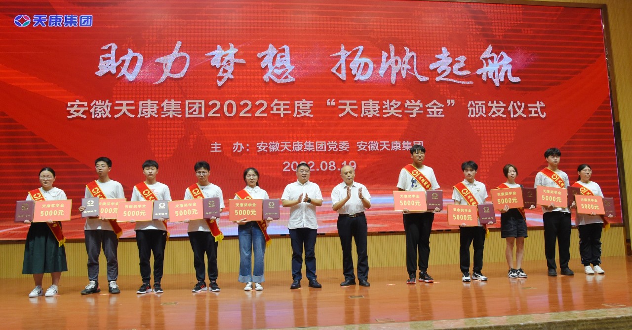 8月19日上午,由安徽天康集團黨委與安徽天康集團共同主辦,集團關工委、工會、團委聯合承辦的“安徽天康集團2022年度‘天康獎學金’頒發儀式”在集團會議中心舉行。共青團天長市委副書記馬翔,集團黨委書記、董事長趙寬,黨委副書記、總經理毛文章,黨委副書記、副總經理趙建兵應邀出席儀式。集團黨委班子成員、集團領導班子成員、銷售副總、銷售經理代表、職能部門負責人、獲得“天康獎學金”學生及家長代表等參加了儀式。