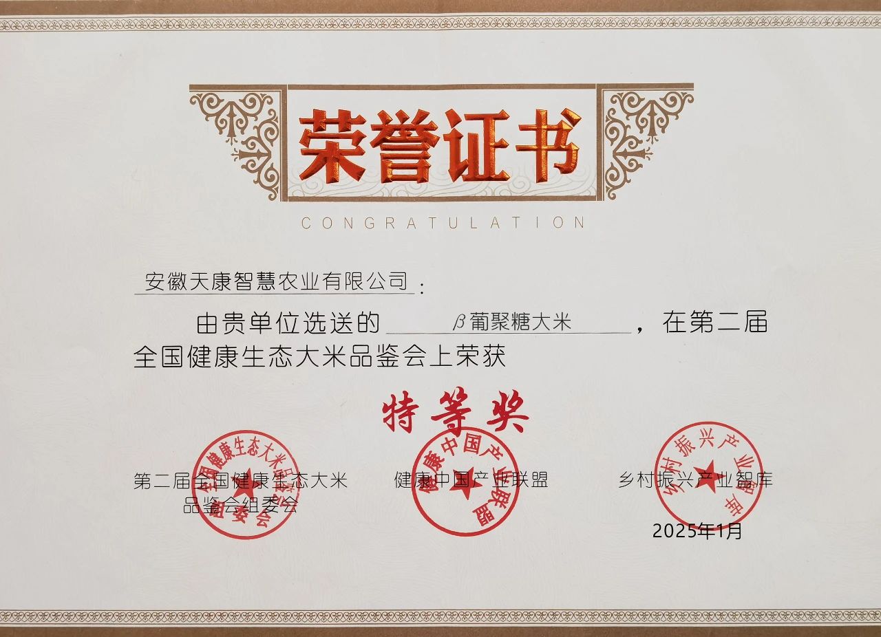 1月19日,由健康中國產業聯盟、鄉村振興產業智庫、《米商》傳媒、《品牌農業傳播》等平臺聯合發起的第二屆全國健康生態大米品鑒會在浙江湖州皇冠假日酒店舉行。經過中檢、華測等國內專業檢測機構的現場嚴格檢測,并由來自江南大學食品學院、浙江工商大學食品與生物工程學院的專家進行口感現場測評,最終從300多個參賽大米樣品中評選出第二屆全國健康生態大米品鑒會特等獎(最高獎)十名,金獎銀獎優勝獎若干。安徽天康智慧農業有限公司的β葡聚糖大米榮獲特等獎,這也是安徽省參賽大米中唯一獲得特等獎的企業。