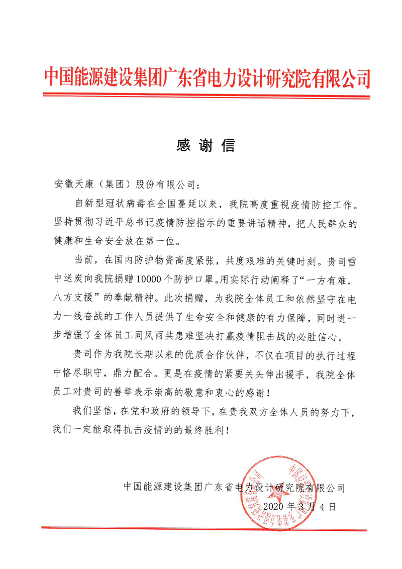 “在抗擊疫情的關鍵時刻,您伸出援助之手,向我單位贈送口罩,為我公司的疫情防控和復工復產工作提供了物資保障……”“在當前防護物資高度緊缺的關鍵時刻,貴司雪中送炭向我院捐贈醫用防護口罩,用實際行動闡釋了‘一方有難,八方支援’的奉獻精神……”“貴司不僅在項目的執行過程中格盡職守,鼎力配合,更是在疫情的緊要關頭伸出援手,我院全體員工對貴司的善舉表示崇高的敬意和衷心的感謝……”一封封感謝信字字真摯,句句暖心,感動著他們,溫暖著我們,更激勵著每一個人。