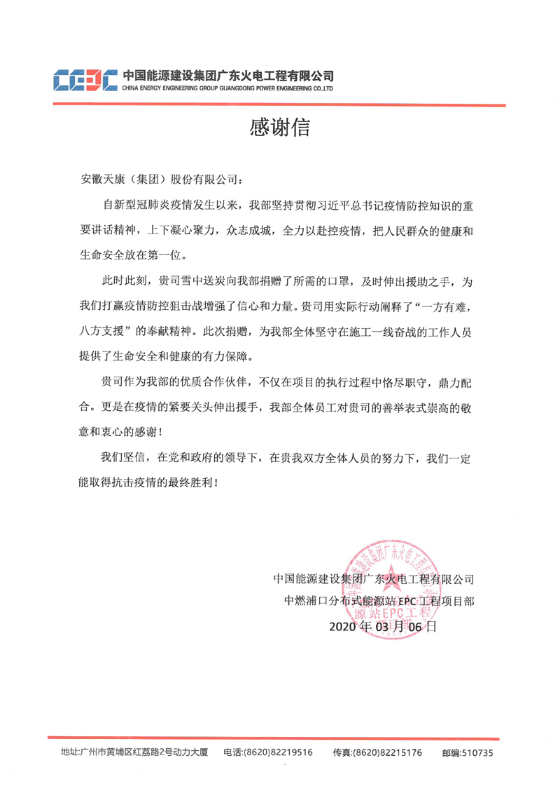 “安徽天康集團的仁義善舉,體現了豈曰無衣、與子同袍的大愛境界,彰顯了一方有難、八方支援的兄弟情懷……”近日,黑龍江應急管理廳、中國能源建設集團廣東電力設計研究院有限公司、中國能源建設集團廣東火電工程有限公司、安徽華塑股份有限公司等單位紛紛發來感謝信,向安徽天康集團在疫情期間的無私援助表達真誠的謝意和敬意。