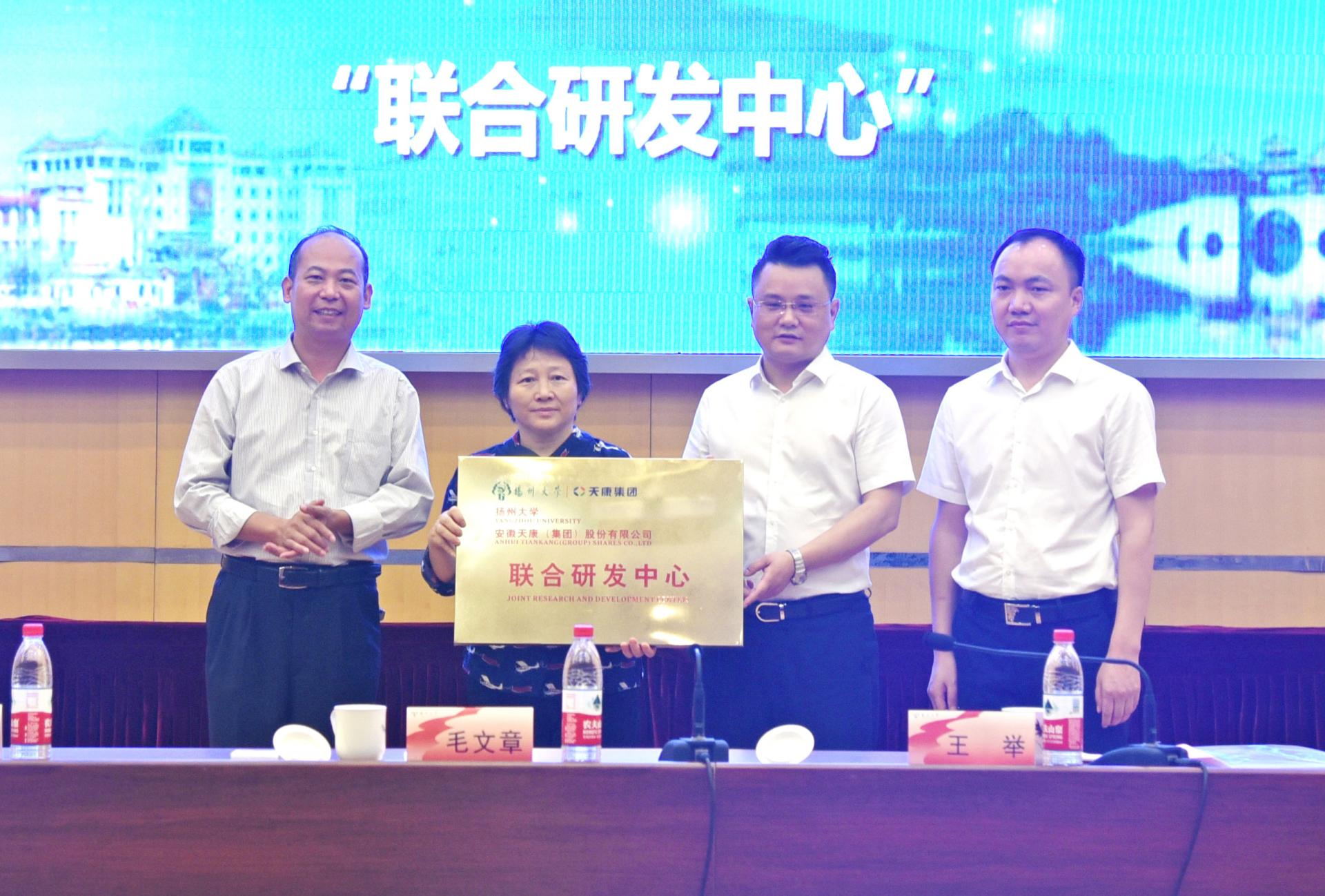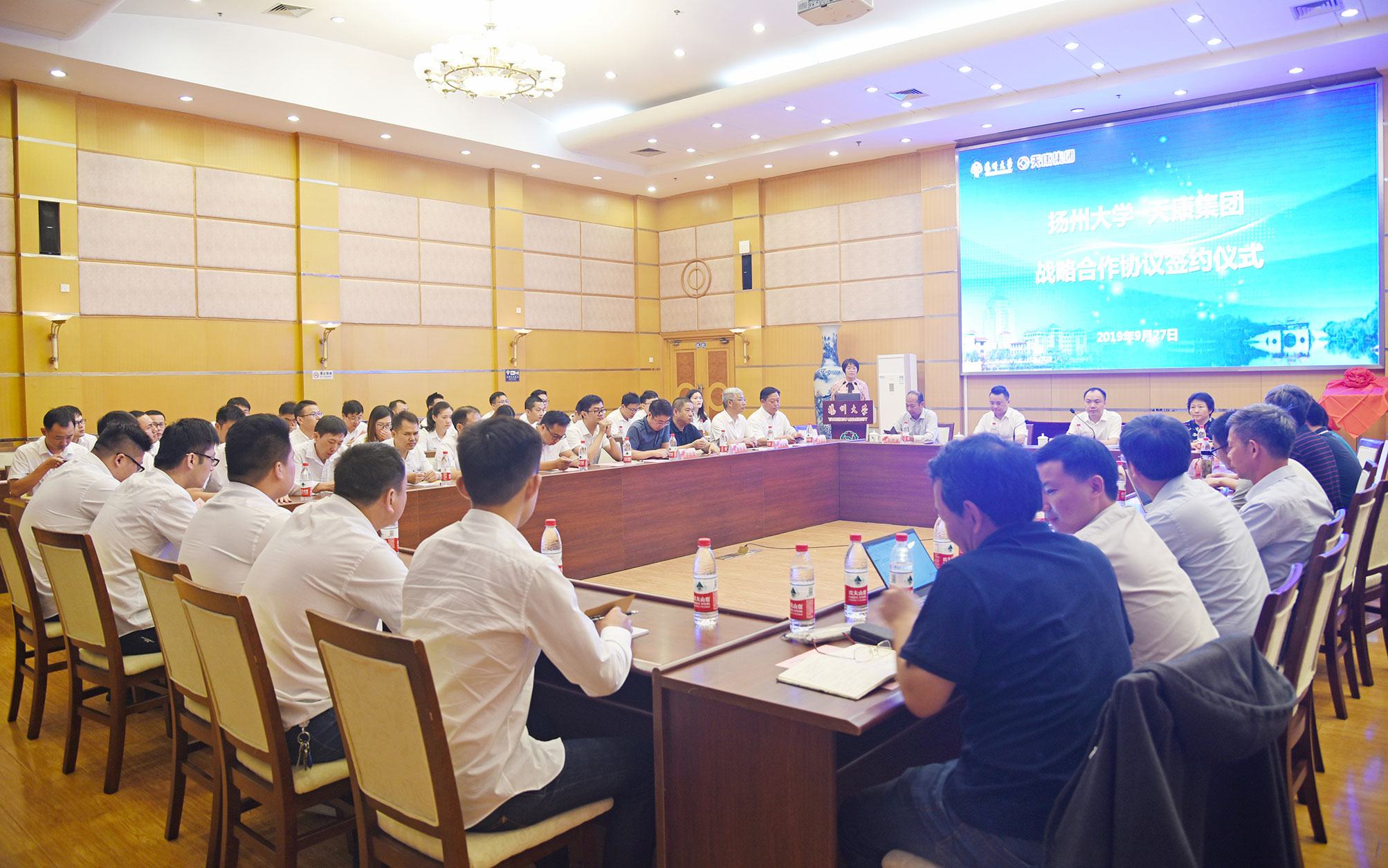 在全場領導和與會人員的共同見證下,揚州大學--安徽天康(集團)股份有限公司聯合研發中心在揚州大學掛牌,天康集團同時成為揚州大學產學研合作基地和教育實習基地。