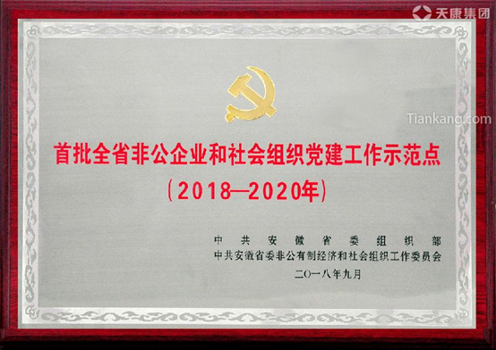 近日,由中共安徽省委組織部、中共安徽省委非公企業和社會組織工委組織評選的首批全省非公企業和社會組織黨建工作示范點正式授牌,安徽天康集團黨委獲此殊榮。