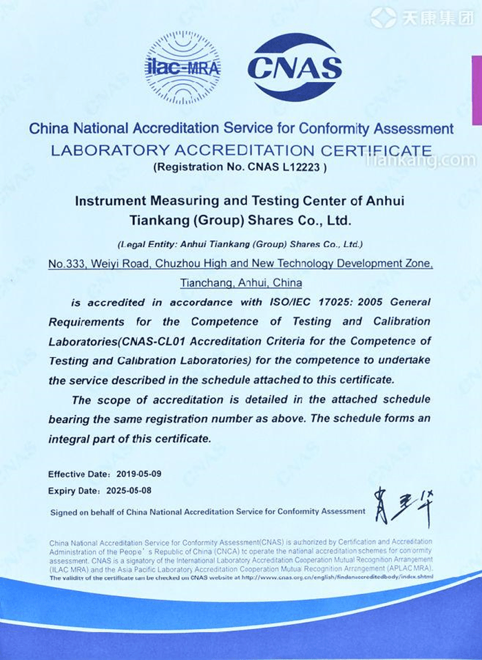 2016年6月,安徽天康集團光電纜檢測中心就獲得CNAS實驗室認可證書,此次安徽天康集團儀器儀表計量檢測中心獲得CNAS實驗室認可證書,表明了安徽天康集團的儀器儀表、光電纜檢驗檢測中心具備了在認可范圍內與國際互認的檢測能力,具有在國際范圍內開展校準的第三方檢測資格,標志著天康集團儀器儀表、光電纜檢驗檢測中心的管理水平、技術水平、整體實力均達到國際水平,所出具準確、可靠的檢測報告也更有公信力,對產品的研發設計、生產制造、品質保障等各方面將提供更強的技術支持,對提升安徽天康集團品牌價值、加強內部質量控制、增強產品的市場競爭力、促進對外貿易合作都具有積極影響。