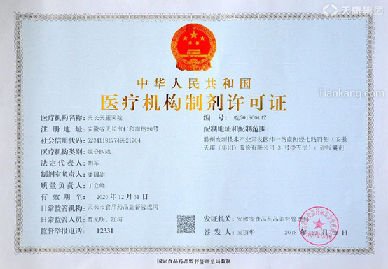 天長天康醫院是一家集醫療、預防保健、康復、科研、教學為一體的新型數字化管理的現代化綜合醫院;2017年底,6200平米的全新制劑生產車間完工,在完成相關設施、設備安裝、調試驗證后,于2018年10月20日通過省食品藥品監督管理局生產現場核查相關工作,11月8日取得《醫療機構制劑許可證》。