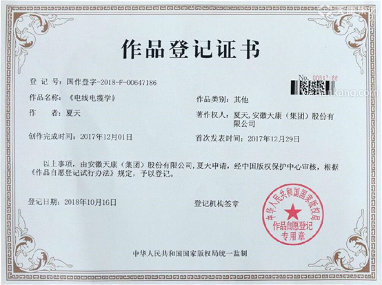 10月16日,中國版權保護中心通過審核,準予技術性書籍《電線電纜學》登記。登記號:國作登字-2018-F-00647186。該書著作權為天康集團高級工程師夏天和安徽天康(集團)股份有限公司,該書通過登記,標志著天康企業文化建設又向前邁了一大步。