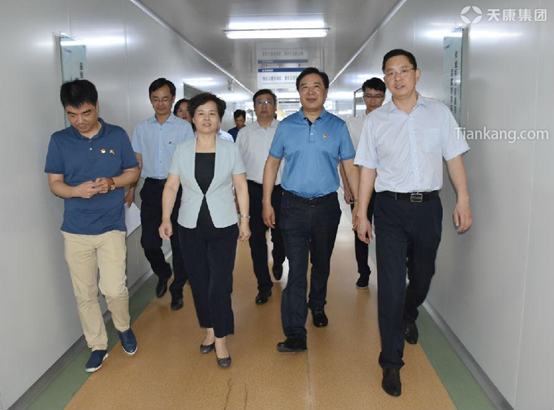 滁州市委常委、組織部長葛建榮(中)在天長市委書記鄧?yán)^敢(左一),市委副書記、市長朱大綱(右二),市委常委、組織部長王瑩(右一)的陪同下蒞臨天康集團(tuán)調(diào)研。天康集團(tuán)董事長趙寬(左二)向葛建榮部長一行介紹企業(yè)發(fā)展情況。