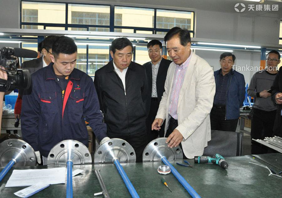 在天康集團(tuán)儀表制造部,董事長(zhǎng)趙寬向許繼偉介紹天康儀器儀表產(chǎn)品的相關(guān)情況。