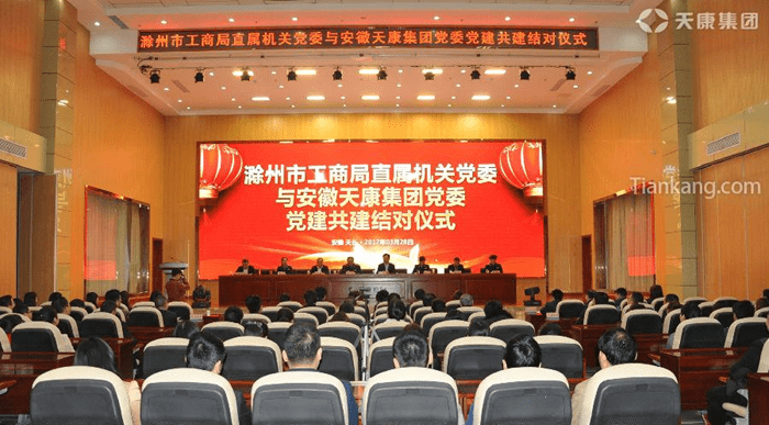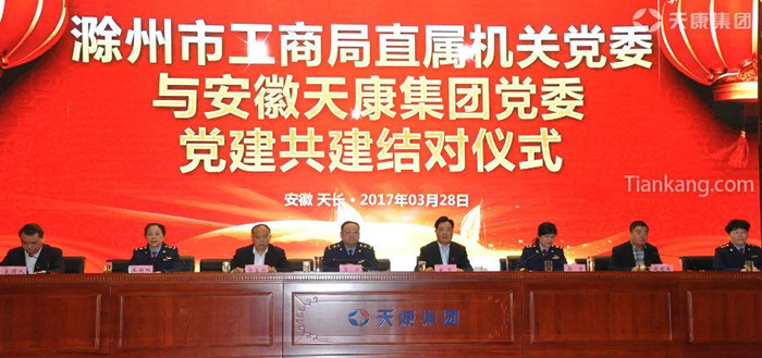 3月28日,滁州市工商局直屬機(jī)關(guān)黨委與安徽天康集團(tuán)黨委黨建共建結(jié)對(duì)儀式在集團(tuán)會(huì)議中心舉行。圖為儀式現(xiàn)場(chǎng)。