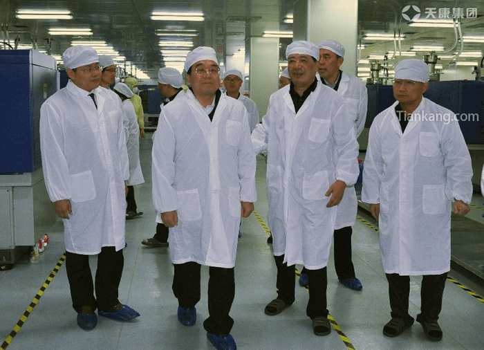 3月6日,安徽省委副書記信長星(左二)在天長市委書記金維加(左一)的陪同下蒞臨天康集團調研工作,天康集團董事長趙寬(右二)在天康醫(yī)療科技生產線向信長星匯報天康集團的相關情況。