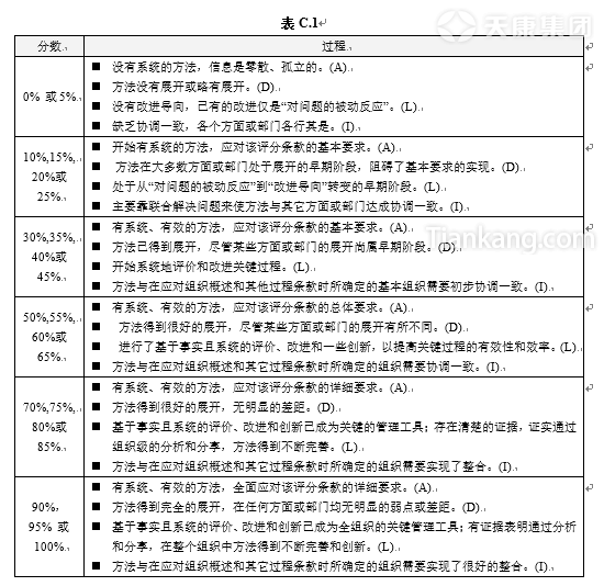 b)給一個(gè)評(píng)分條款評(píng)分時(shí),首先判定哪個(gè)分?jǐn)?shù)范圍檔次(如50%-65%)總體上“最適合”組織在本評(píng)分條款達(dá)到的水平。總體上“最適合”并不要求與分?jǐn)?shù)范圍檔次內(nèi)的每一句話完全一致,允許在個(gè)別要素(過(guò)程的A-D-L-I要素或結(jié)果的Le-T-C-I要素)上有所差距。