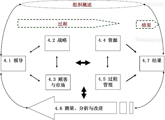 e) “領(lǐng)導(dǎo)”、“戰(zhàn)略”、“顧客與市場(chǎng)”構(gòu)成“領(lǐng)導(dǎo)作用”三角,是驅(qū)動(dòng)性的,旨在強(qiáng)調(diào)領(lǐng)導(dǎo)對(duì)戰(zhàn)略和顧客與市場(chǎng)的關(guān)注;“資源”、“過(guò)程管理”、“結(jié)果”構(gòu)成“資源、過(guò)程和結(jié)果”三角,是從動(dòng)性的,顯示利用資源,通過(guò)過(guò)程管理取得結(jié)果。而“測(cè)量、分析和改進(jìn)”是組織運(yùn)作的基礎(chǔ),是鏈接兩個(gè)三角的“鏈條”,并轉(zhuǎn)動(dòng)著改進(jìn)和創(chuàng)新的PDCA之輪。