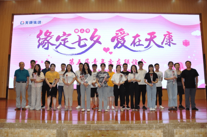 為關心呵護青年員工的個人生活問題,給適齡單身青年搭建一個良好的交友、交流平臺。8月7日下午,集團團委召集了集團適齡青年男女共聚一堂,開展了 “緣定七夕,牽手天康”第五屆青年交友聯誼活動,活動由集團工會主席閔玉軍主持。活動分為兩個部分,首先是請每位青年男女上臺做自我介紹和才藝表演,然后進行抽簽分組,根據抽簽結果,由男生為數字相同的女生送上一朵玫瑰花,并與之進行5分鐘的交談。活動最后,大家一起進行合影留念。